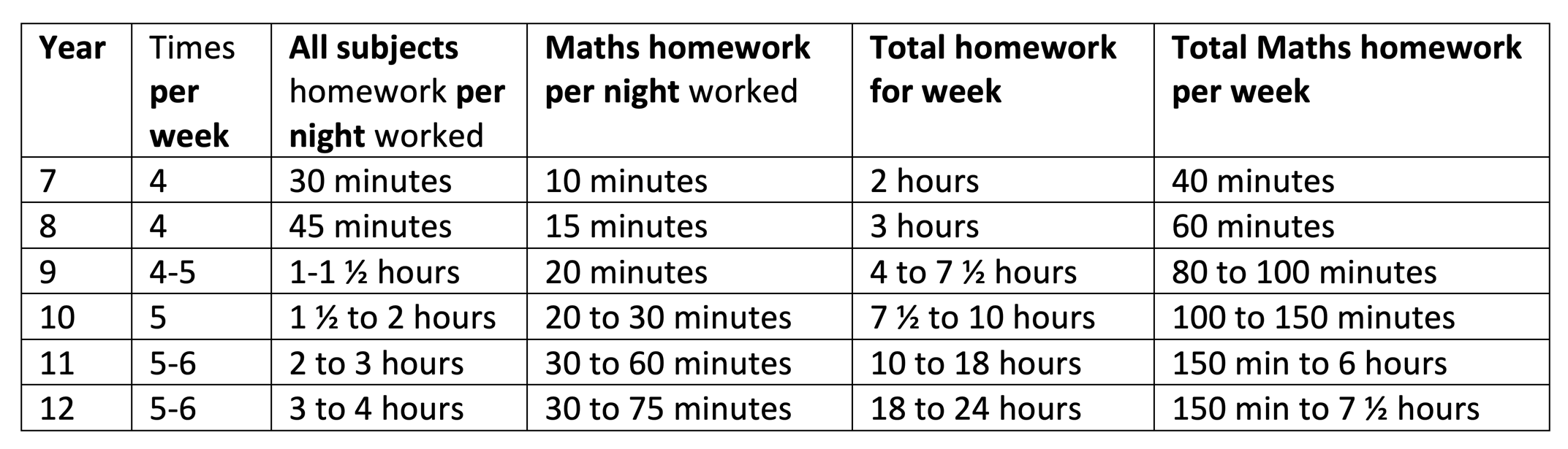 Secondly, help your child develop good homework habits. This does not have to be hours and hours unless they are in Years 9-12 and doing the top levels of Maths. The best way to do this is to have them do a manageable amount (see table below) at least 4 nights out of 7. What they do is important. Ideally, they should be doing practice of questions that are easy for them but are reinforcing the concepts taught recently in class. This is provided there are few gaps. We will come to “gap filling” shortly. Most teachers should be able to tell you what this should be. Usually it will be a question from the textbook or online list depending what is being covered.